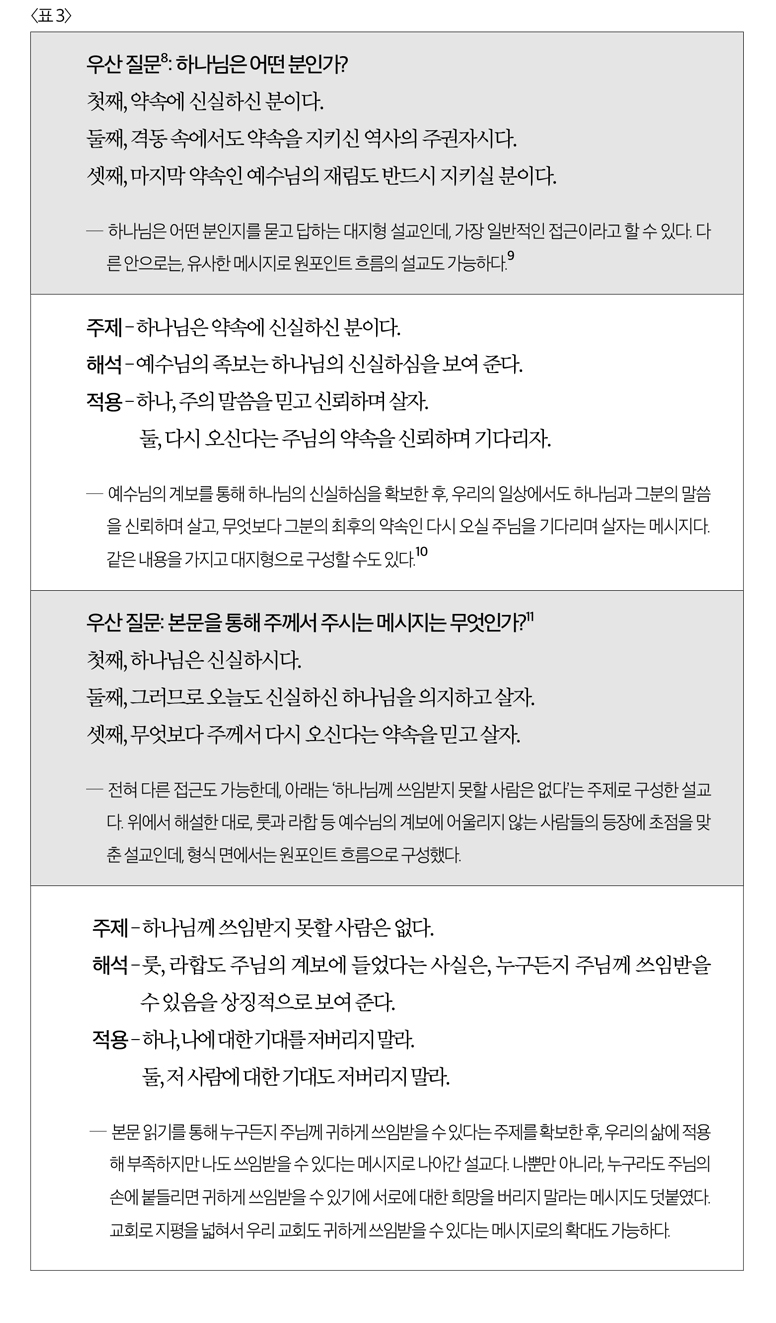 ¿¹¸¦ µé¾î, ¸¶Åº¹À½ 1:1-17ÀÇ ¿¹¼ö´ÔÀÇ °èº¸ º»¹®À̶ó¸é, ÀÏ¹Ý ÁÖ¼®ÀÇ °æ¿ì´Â Àýº° ÇØ¼³¿¡ ±âÃÊÇØ ¿¹¼ö´ÔÀÌ ±¸¾àÀÇ ¿¹¾ðµÈ ¸Þ½Ã¾Æ·Î ¿À¼Ì´Ù´Â Àǹ̿¡ ÃÊÁ¡À» ¸ÂÃâ °ÍÀÌ´Ù. ±×°ÍÀÌ ¹®¸Æ ¾È¿¡¼ ¿¹¼ö´ÔÀÇ Á·º¸°¡ ¿øµ¶ÀÚ¿¡°Ô Àü´ÞÇÏ´Â ÀǹÌÀ̱⠶§¹®ÀÌ´Ù. ÀÌ¿¡ ¹ÝÇØ ¼³±³Àû ÁÖ¼®Àº º¸´Ù Àû¿ëÀûÀ̰í âÁ¶ÀûÀÎ ¸Þ½ÃÁö·Î ³ª¾Æ°¥ ¼ö ÀÖ´Ù. ¾à¼ÓÀ» ÁöŰ½Ã´Â Çϳª´ÔÀÇ ½Å½ÇÇϽɿ¡ ÃÊÁ¡À» ¸ÂÃâ ¼öµµ ÀÖ°í, ¿ª»çÀÇ °Ýµ¿ ¼Ó¿¡µµ ±â¾îÄÚ ¾à¼ÓÀ» ÁöŰ½Ã´Â Çϳª´ÔÀÇ ÁÖ±ÇÀ» ¼³±³ÀÇ Á߽ɿ¡ ¼¼¿ì¶ó°í Á¶¾ðÇÒ ¼öµµ ÀÖ´Ù. ȤÀº ÁÖ´ÔÀÇ °èº¸¿¡ ±×¸® ¾î¿ï¸®Áö ¾Ê´Â ±â»ý ¶óÇÕ°ú ÀÌ¹æ ¿©ÀÎ ·íÀÇ µîÀå¿¡ ±âÃÊÇØ ÁÖ´ÔÀÌ ¾²½ÃÁö ¸øÇÒ »ç¶÷Àº ¾ø´Ù´Â ¸Å¿ì Àû¿ëÀûÀÎ ¸Þ½ÃÁö¸¦ ¼Ò°³ÇÒ ¼öµµ ÀÖ´Ù.